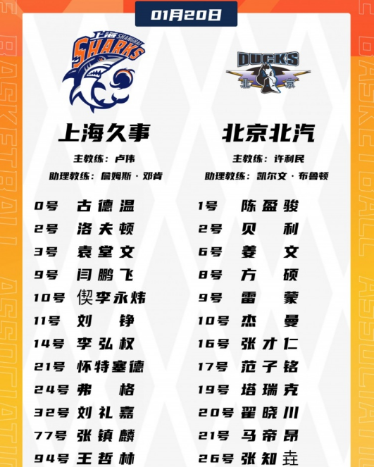 上海:古德温24分,怀特塞德16分14篮板3盖帽,洛夫顿11分,张镇麟3记三分9分,王哲林4分7篮板2助攻。北京:翟晓川12分6篮板3助攻2抢断,陈盈骏8分,杰曼14分8篮板5助攻,贝利15分。